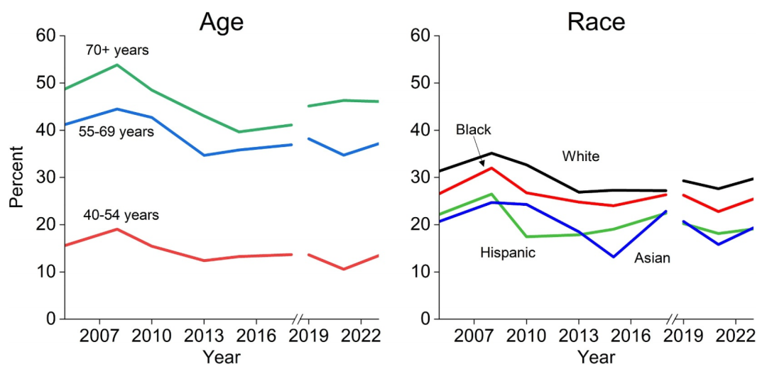在50岁及以上的男性中,37%报告在过去一年内进行过PSA检测。筛查率在白人男性、男同性恋者、教育程度和收入较高者,以及拥有私人保险或医疗保险(65岁及以上)的男性中最高。筛查率在2008年达到44%的峰值,随后在2013年下降至34%。有趣的是,尽管美国USPSTF不建议该年龄组进行筛查,但70岁及以上男性的PSA检测率一直高于55-69岁男性(2023年高出24%)。部分原因可能是自2000年以来,医疗保险已覆盖所有50岁及以上男性的PSA检测。事实上,2021年发表的一项研究发现,在有私人保险的男性中,筛查率在推荐筛查年龄组中最高。这可能是因为与医疗保险相比,私人保险公司的承保要求更严格,而在推荐筛查年龄组内,医疗保险受益人的筛查普及率高于有私人保险的男性。