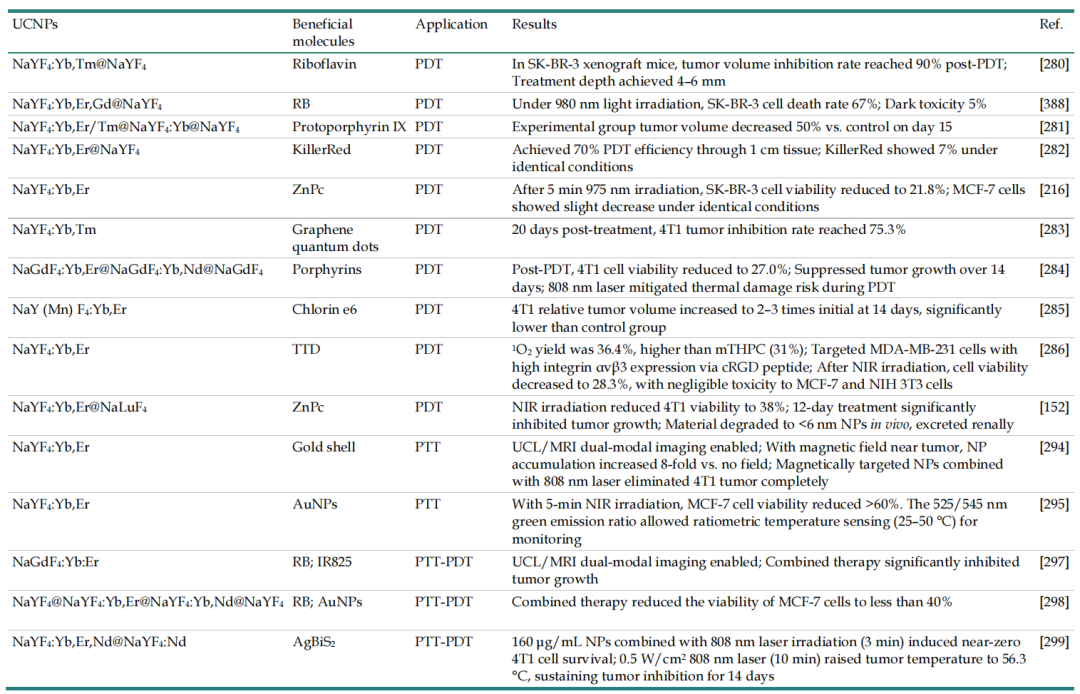 光动力治疗与光热治疗因局部作用强、全身毒性低,成为癌症治疗的重要方向,UCNPs可解决传统光疗“穿透浅、激活难”的问题。具体而言,UCNPs吸收近红外光后发射可见/紫外光,激活光敏剂生成活性氧。例如,NaYF4:Yb,Er NaLuF4负载ZnPc后,在980nm激光照射下,4T1细胞存活率降至38%,12天内肿瘤生长显著抑制。在光热治疗中,UCNPs与金纳米粒子、聚多巴胺等光热剂结合,实现高效光热转换。如金壳修饰的NaYF4:Yb,Er,在808nm激光照射下可将肿瘤温度升至56.3℃,联合磁靶向可完全清除4T1肿瘤,且无复发。更重要的是,UCNPs可实现光动力与光热治疗的协同,例如,NaGdF4:Yb,Er NaGdF4负载玫瑰红与IR825,980nm光激活玫瑰红生成活性氧,808nm光触发IR825产热,联合治疗对4T1细胞凋亡率达73.1%,显著优于单药治疗。