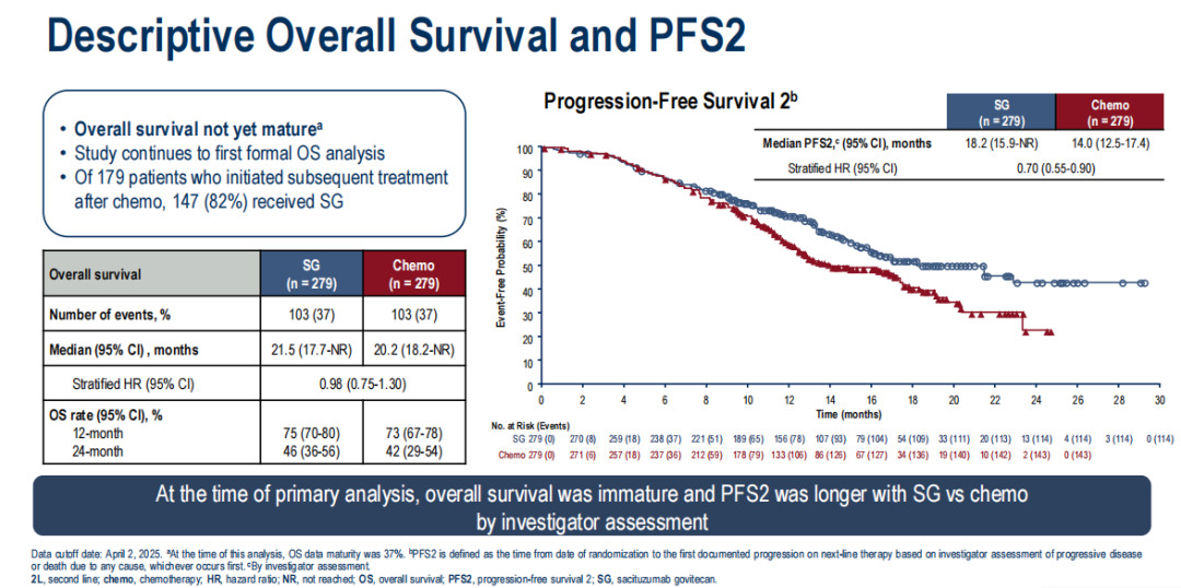 次要终点:SG组和化疗组的ORR相似(48%vs 46%),但SG组的持续缓解时间(DoR)较化疗组延长5个月(12.2 vs 7.2个月)。化疗组中有179例患者接受了后续治疗,而其中147例(82%)为SG治疗。SG组的PFS2(从随机到二线治疗发生进展或死亡)相较于化疗组延长4.2个月(18.2 vs 14.0个月,HR 0.40,95%CI:0.55-0.90)。OS数据尚未成熟。
