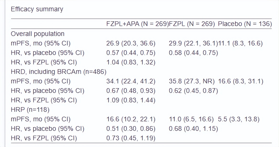 在总体人群中,氟唑帕利联合阿帕替尼(n=269)相比氟唑帕利单药(n=269)未显著增加治疗获益,中位PFS分别为26.9个月vs.29.9个月(HR=1.04)。在同源重组功能正常(HRP)患者中,氟唑帕利联合阿帕替尼组和氟唑帕利组的中位PFS分别为16.6个月vs.11.0个月(HR=0.73)。