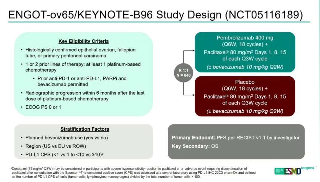 参考文献Colombo N,et al.Pembrolizumab vs placebo plus weekly paclitaxel±bevacizumab in platinum-resistant recurrent ovarian cancer:results from the randomized double-blind phase 3 ENGOT-ov65/KEYNOTE-B96 study.ESMO Congress 2025-LBA3