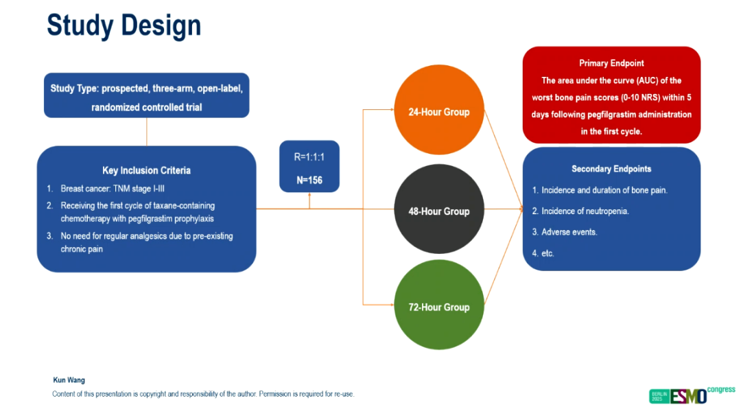 王坤教授:在该研究中我们入组的是1-3期的乳腺癌患者,这些患者有中高危的出现中性粒细胞下降的风险,他们按照1∶1∶1比例随机进入了24、48和72组。主要终点是首个化疗周期中连续五天每日最严重骨痛评分(0-10数字评分法)的曲线下面积。次要终点包括严重骨痛(NRS评分>5分)的发生率和持续时间,以及中性粒细胞减少症和发热性中性粒细胞减少症的发生率。