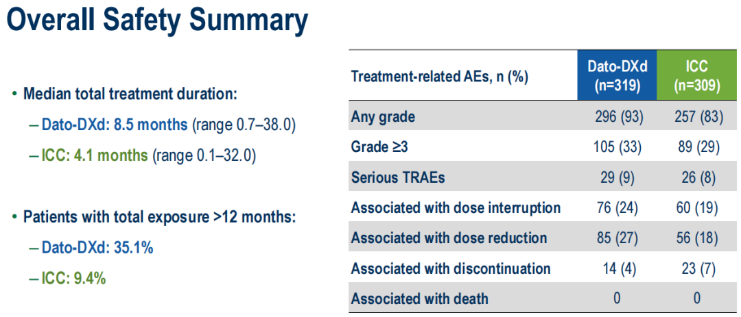 另一方面,Dato-DXd治疗相关的中性粒细胞减少发生率较低,但研究中没有对患者进行最低点血常规检测,所以需要观察临床研究外的表现;同时,Dato-DXd治疗相关的口腔炎、干眼症发生率较高,以我的个人经验,干眼症大多对患者影响不大且通常可控,但口腔炎需要进行处理,预防的进展主要是使用含类固醇漱口水,可使患者达到对治疗的最佳耐受。
