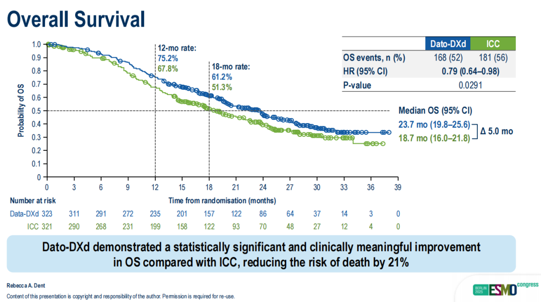 首先,ASCENT-03研究鼓励入组患者在二线或三线治疗中交叉使用戈沙妥珠单抗(SG),因此在脱离研究预设治疗后,使用SG治疗的患者比例高于TROPION-Breast02研究,这对研究OS数据有重要影响,因为SG在二线/三线治疗中有OS明确获益。其次,TROPION-Breast02研究纳入了疾病复发更早的患者(编者注:即不限制无病间隔/DFI),包括在疾病早期阶段治疗结束后立即复发的患者,这是非常重要的患者亚组,临床需求最为迫切,实际入组患者有15%符合该情况;而且我相信,随着以KEYNOTE-522研究为代表的免疫新辅助治疗方案在早期TNBC中得到更多应用,虽然会使更多患者实现治愈,但免疫治疗后的疾病复发通常出现更早,且肿瘤已有耐药性,因此疾病复发更早的患者群体,也会随着时间推移不断扩大,TROPION-Breast02研究纳入此类患者值得赞赏,而ASCENT-03研究则要求患者DFI≥6个月。