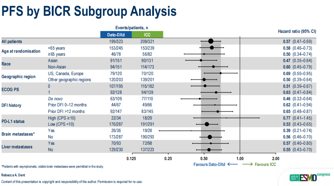 研究亚组分析结果显示,Dato-DXd在各个关键亚组中均有一致的PFS疗效优势,如按DFI时长划分时,新发转移(de novo)、DFI为0-12个月及&gt;12个月亚组的PFS HR值分别为0.46、0.62和0.65,对PD-L1高表达即CPS≥10,以及PD-L1低表达即CPS<10亚组的患者,PFS HR值分别为0.77和0.53;无论患者基线是否存在脑/肝转移,都不会影响Dato-DXd治疗的PFS获益,其中基线有脑转移患者PFS HR值低至0.39,提示Dato-DXd治疗获益明显,OS亚组分析结果也与PFS呈一致趋势。