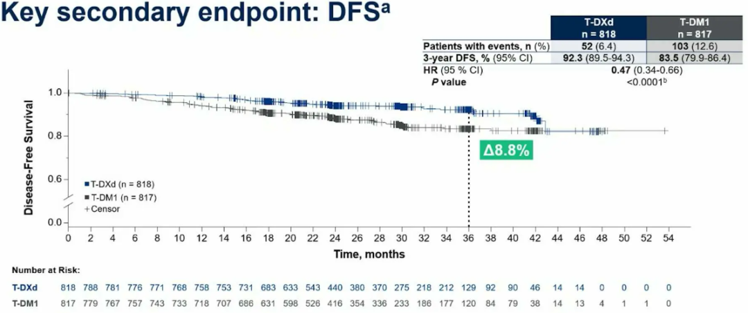 在关键次要终点DFS方面,T-DXd较T-DM1将疾病复发或死亡风险(DFS)显著降低了53%(HR 0.47,95%CI 0.34-0.66,P<0.0001),3年DFS率为92.3%vs 83.5%。