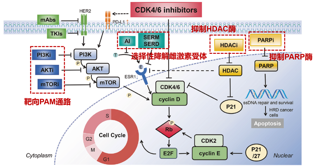 CDK4/6i跨线治疗目前仍存在比较大的争议,主要循证医学证据源于postMONARCH研究,显示CDK4/6i+ET跨线治疗的mPFS为6.0个月,优于ET对照组[3]。然而,其他多项CDK4/6i跨线挑战却宣告失败,该策略仍需更多研究、更大样本予以验证。在新型靶向治疗方面,临床应用则需生物标志物筛查,仅部分优势人群可以获益。如BYLieve研究中PI3K抑制剂+ET、CAPItello-291研究中AKT抑制剂+ET等所取得的mPFS为5.6个月~8.0个月,且只针对特定突变人群[4,5]。此外,在ET框架下,新型口服SERD、HDAC抑制剂也在不断探索,mPFS获益在3.8个月~7.4个月不等,尚无总生存期(OS)获益证据[6,7,8]。