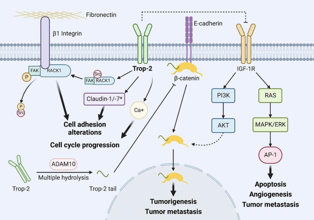 [TROP2通过与胰岛素样生长因子1(IGF-1)形成复合物来抑制IGF-1R信号通路。此外,TROP2通过RAS-MAPK/ERK通路下调转录因子激活蛋白1(AP-1),从而抑制细胞凋亡、血管生成和肿瘤转移。TROP2的活性片段裂解后与β-catenin结合,导致β-catenin从E-cadherin上解离并转位至细胞核,启动参与肿瘤形成和转移的基因转录。TROP2激活β1整合素-RACK1-FAK-Src信号通路,该通路调节肿瘤细胞与纤连蛋白的黏附。作为一种跨膜钙信号蛋白,TROP2介导的钙释放对细胞周期进程至关重要。]