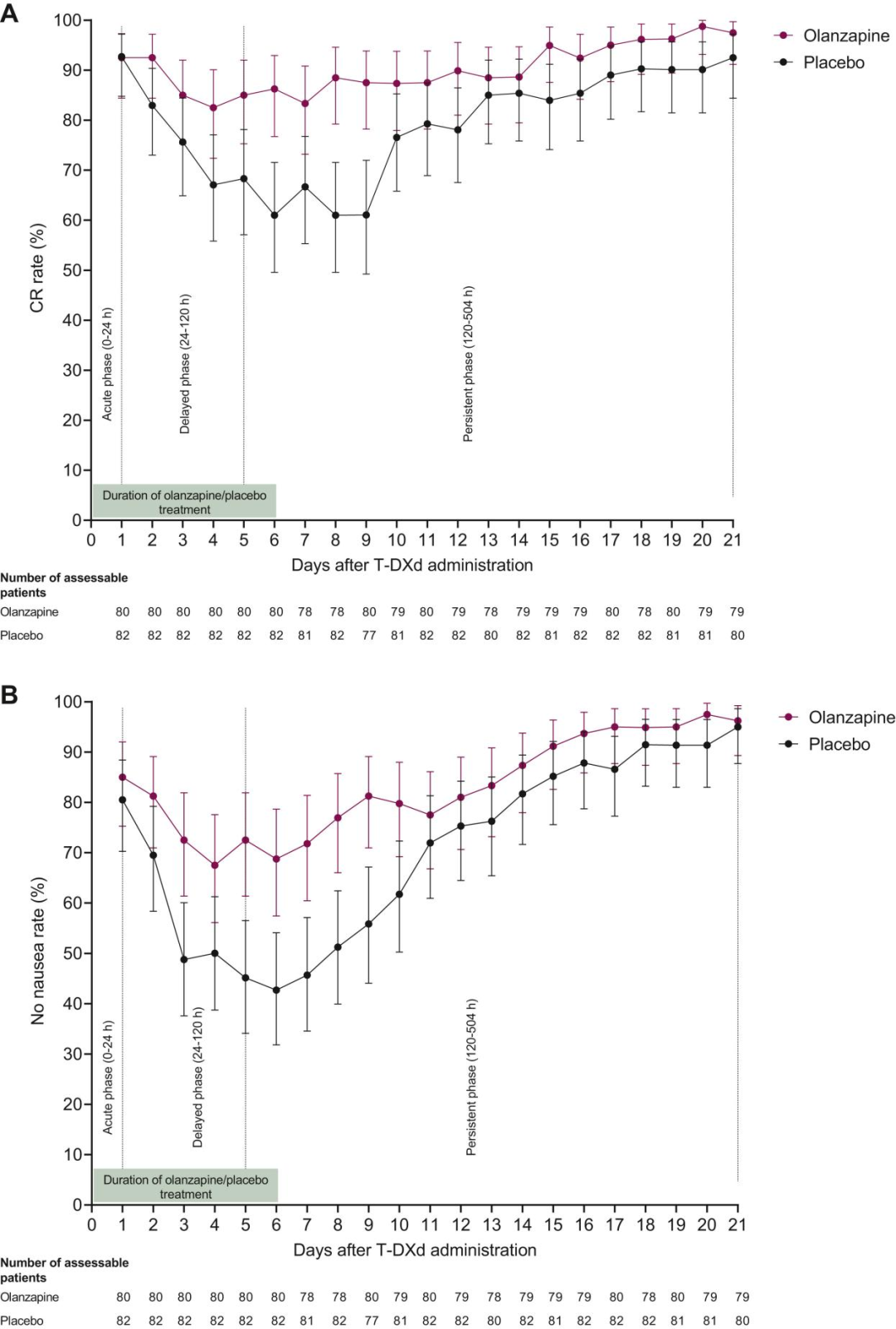 本研究在对接受首个周期T-DXd治疗的患者中,比较奥氮平与安慰剂(均联用5-HT3受体拮抗剂与地塞米松)在延迟期(T-DXd起始开始后的24-120小时),症状完全缓解(CR,定义为无呕吐且无使用抢救药物)发生率上的差异;次要目标包括评估持续期(治疗起始后120-504小时)及整体观察期(全部504小时)内的症状控制情况、无恶心率及安全性等。