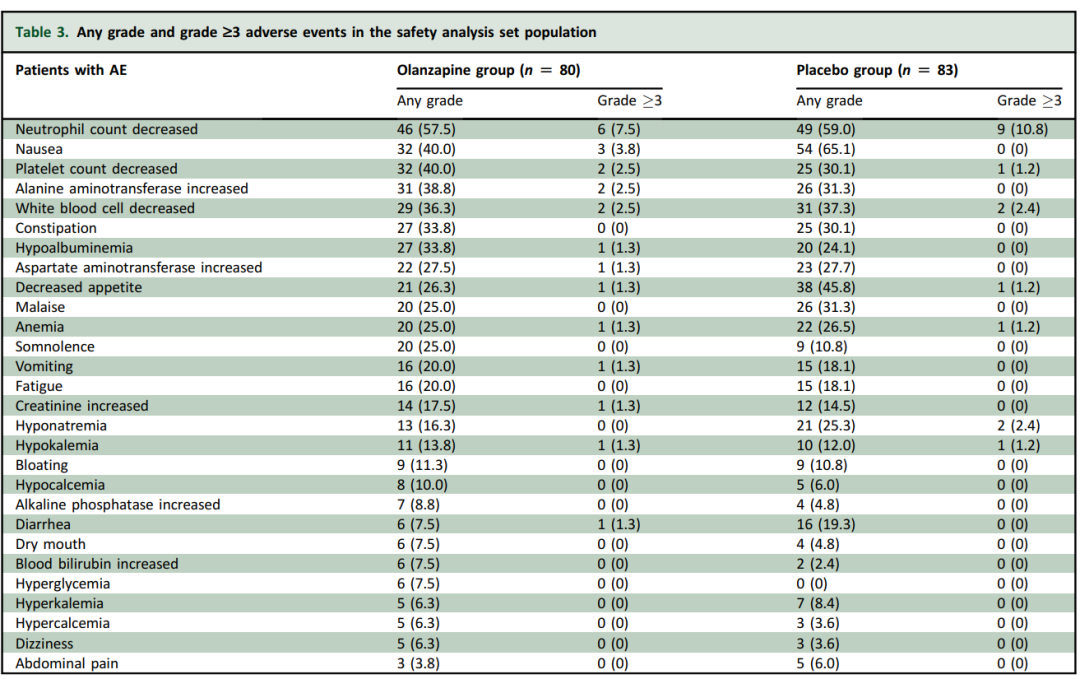 奥氮平治疗的总体安全性可接受,其中奥氮平组患者嗜睡的发生率高于对照组(25.0%vs 10.8%),但均为低至中度事件,无3级以上嗜睡报告;高血糖仅在奥氮平组观察到(7.5%),但未见高级别事件;其他不良事件发生率在两组间存在差异,但大多可管可控,并未出现与研究药物直接相关的严重、不可逆损害或死亡事件。