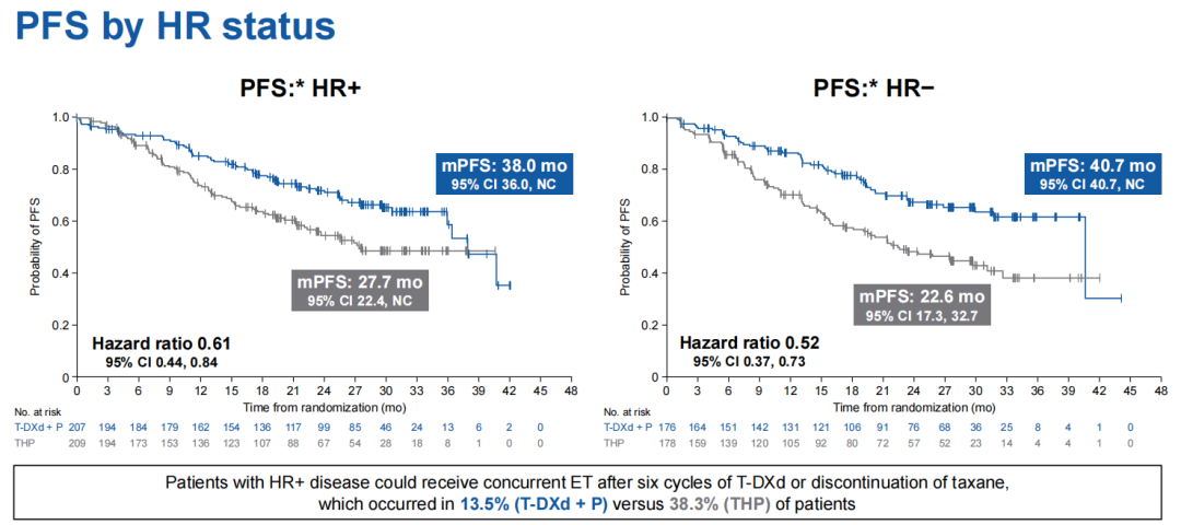 分析数据显示,T-DXd+P组和THP组亚洲患者由盲态独立中心评估(BICR)的mPFS为40.7个月和27.4个月,两组24个月PFS率为73.7%对52.8%,T-DXd+P方案使患者疾病进展或死亡风险显著下降45%(HR 0.55,95%CI:0.39-0.78),由研究者评估的mPFS也呈现一致趋势(40.7个月vs.21.5个月,HR 0.47,95%CI:0.33-0.65),上述数据呈现的T-DXd+P组获益趋势,也与研究全球人群数据保持一致(mPFS,40.7个月vs.26.9个月,HR 0.56)。