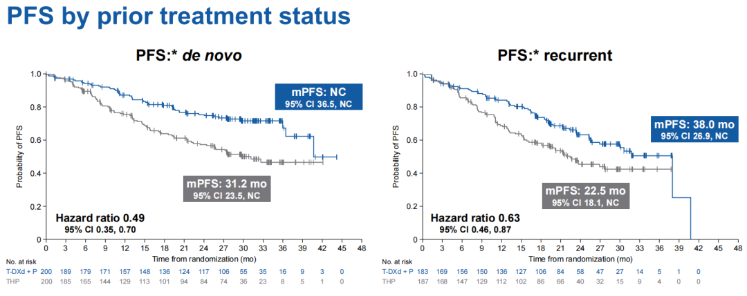 随后,DB-09研究的关键亚组分析结果于2025年欧洲肿瘤内科学会(ESMO)年会以口头报告形式公布[3]:初诊晚期患者接受T-DXd+P方案获益更为明显,mPFS迄今尚未达到,风险比(HR)值低至0.49,提示初诊患者选择T-DXd+P方案作为一线治疗,即有望实现长期控制病情和深度缩瘤;复发患者也可从T-DXd+P方案治疗中得到显著PFS获益,mPFS同样长达38.0个月。