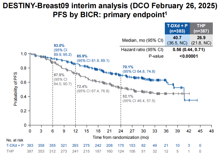 自研究期中分析结果在2025美国临床肿瘤学会(ASCO)年会首度亮相以来,DB-09研究就始终处在国际学术会议的C位,不断展现T-DXd+P方案用于HER2阳性晚期乳腺癌一线治疗的全面优势。首先在ASCO年会公布的DB-09研究全球人群期中分析数据显示,T-DXd+P组和THP组由BICR评估的mPFS分别为40.7个月和26.9个月,T-DXd+P方案治疗使疾病进展或死亡风险显著降低44%(HR 0.56,95%CI:0.44-0.71,P<0.00001),且各亚组PFS获益和总体安全性一致;两组ORR为85.1%vs.78.6%,CR率为15.1%vs.8.5%。