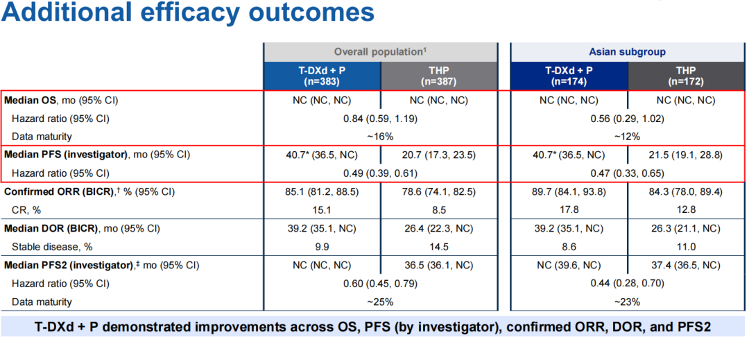 本次公布的DB-09研究亚洲人群分析数据,覆盖T-DXd+P组(n=174)和THP组(n=172)亚洲患者,占研究相应治疗组患者总数约50%,两组患者基线特征整体可比,与全球人群也大致相似,如激素受体(HR)阳性患者占比约46.5%,初诊(de novo)复发/转移患者占49.4%,中位随访时间为30.2个月(截至2025年2月25日)。