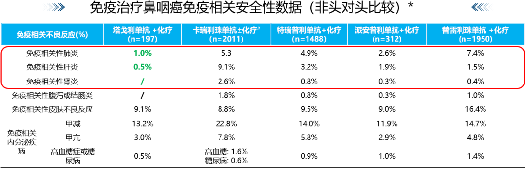 在安全性方面,塔戈利单抗凭借其经过Fc段修饰的独特分子结构,有效降低了免疫相关不良反应(irAE)的发生风险,尤其临床上特别关注的免疫相关性肺炎发生率较低*,也为中国的复发或转移性鼻咽癌患者构筑了安全有效的全程治疗防线。