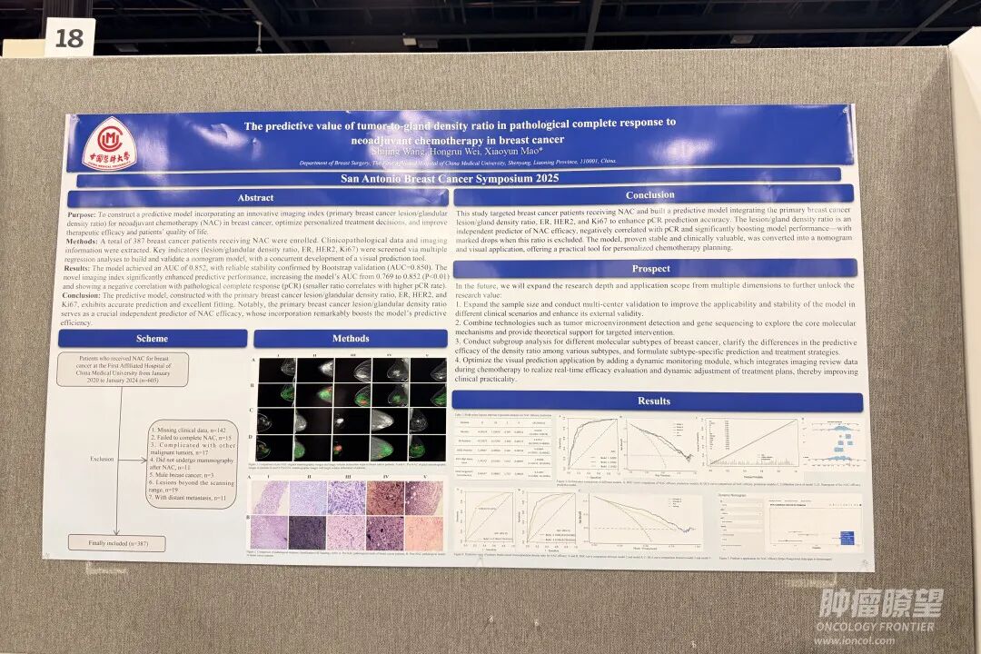 编者按:2025年第48届圣安东尼奥乳腺癌研讨会(San Antonio Breast Cancer Symposium,SABCS)于12月9日-12日在美国圣安东尼奥召开。中国医科大学附属第一医院毛晓韵教授领衔(主要研究者:汪时劲、魏宏芮)的一项回顾性研究在本会议上进行了壁报展示(摘要编号:P4-05-18),该研究开发并验证了一种基于术前乳腺钼靶影像特征和临床病理指标的列线图模型,用于预测乳腺癌患者新辅助化疗(Neoadjuvant chemotherapy,NAC)后的病理完全缓解(Pathological complete response,pCR)概率。该模型展现出优异的预测性能和校准能力,决策曲线分析表明其在较宽的阈值概率范围内具有显著的临床净获益。这一研究成果为乳腺癌患者NAC疗效的术前精准预测提供了有力工具,有助于指导个体化治疗决策。肿瘤瞭望特邀毛晓韵教授进行介绍,并邀请陆军军医大学大坪医院徐琰教授对该研究进行点评。