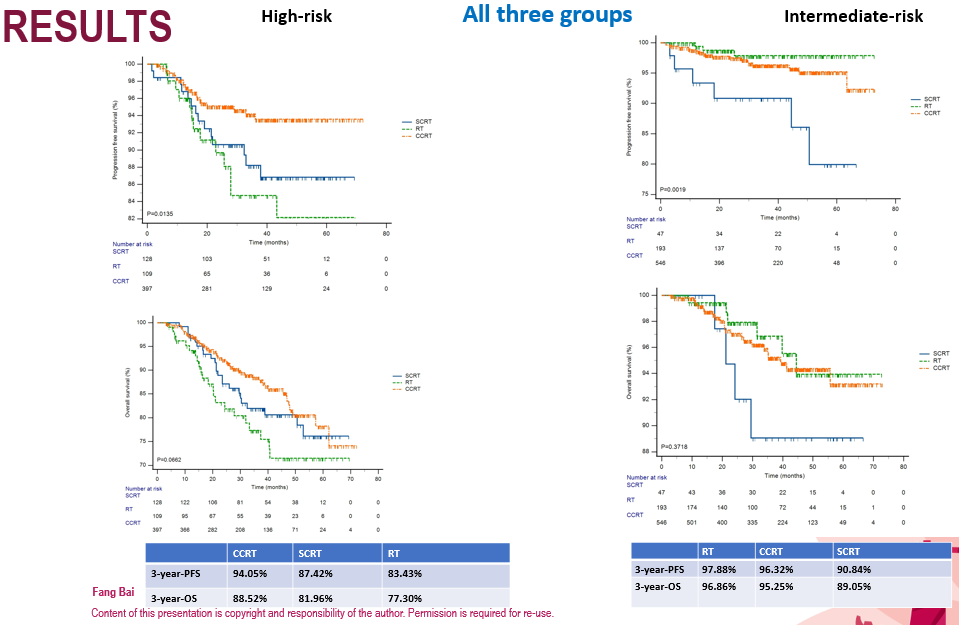 共确定了1436例患者,中位随访时间为32个月。在高危患者中,同步放化疗的3年无进展生存(PFS)率优于序贯放化疗/单纯放疗,但总生存期无显著差异。对于中危患者,单纯放疗/同步放化疗的3年PFS优于序贯放化疗,总生存期相当。