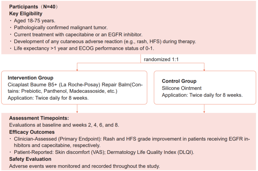 该研究于2024年10月-2025年6月共纳入了40名患者,EGFR抑制剂和卡培他滨治疗相关皮肤不良反应各20例,按1:1的比例随机分配至干预组和对照组,两种措施均每日使用两次,持续8周,干预的时间足以支撑疗效评价。在基线、第2、4、6、8周予以评估,评估指标包括临床医生评估的皮疹和手足综合征(HFS)分级改善情况,患者报告的皮肤不适感(VAS评分)和皮肤病生活质量指数(DLQI)。