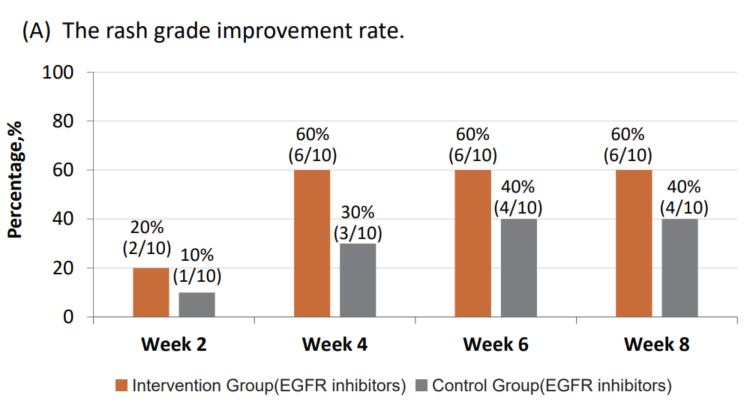 该研究所取得的结果令人鼓舞,结果显示:干预组的皮疹分级改善率和手足综合征(HFS)分级改善率在整个8周期间均持续高于对照组,干预组皮疹在第2周即明显改善、HSF在第4周明显改善。在患者报告结局(PRO)方面,干预组的皮肤不适感和生活质量评分自第2周出现快速且持续的显著改善,对照组的改善并不明显。从而初步证实了使用功效护肤品的防治效果。
