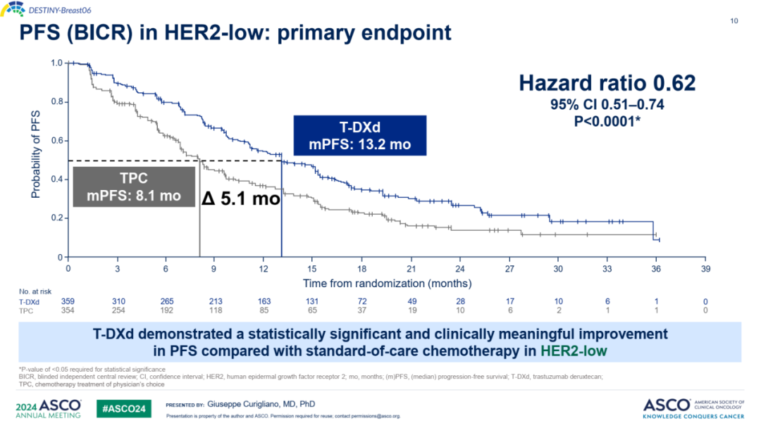 陈占红教授:在DB-04研究基础上,DB-06研究进一步拓展了T-DXd的治疗边界和治疗线数,不仅从HER2阳性患者向HER2低表达患者拓展,还在HR+患者中将应用前移至未经化疗的患者;而DB-06研究结果显示,主要研究终点即HER2低表达患者的中位PFS长达13.2个月,较对照组(8.1个月)延长了5.1个月,HR值低至0.62,提示T-DXd用于内分泌治疗和CDK4/6抑制剂经治患者的临床价值,也支持相应适应证在全球获批。