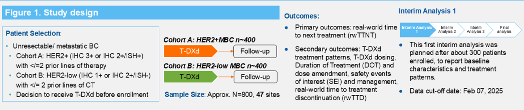 REFRESH研究是一项多中心、前瞻性、双队列观察性研究,在全国47家中心纳入约800例使用T-DXd治疗的晚期乳腺癌患者,分为纳入HER2阳性患者的队列A与纳入HER2低表达患者的队列B,研究终点为各队列在真实世界中至下一线治疗或死亡的时间(rwTTNT)。此次在ESMO Asia大会报道的是研究的第一次期中分析结果,包括患者基线特征及研究次要终点之一——真实世界中T-DXd治疗模式,提供多层次的临床洞见;未来在数据进一步成熟之后,我们也会披露包括T-DXd真实世界疗效、安全性等在内的更多数据。