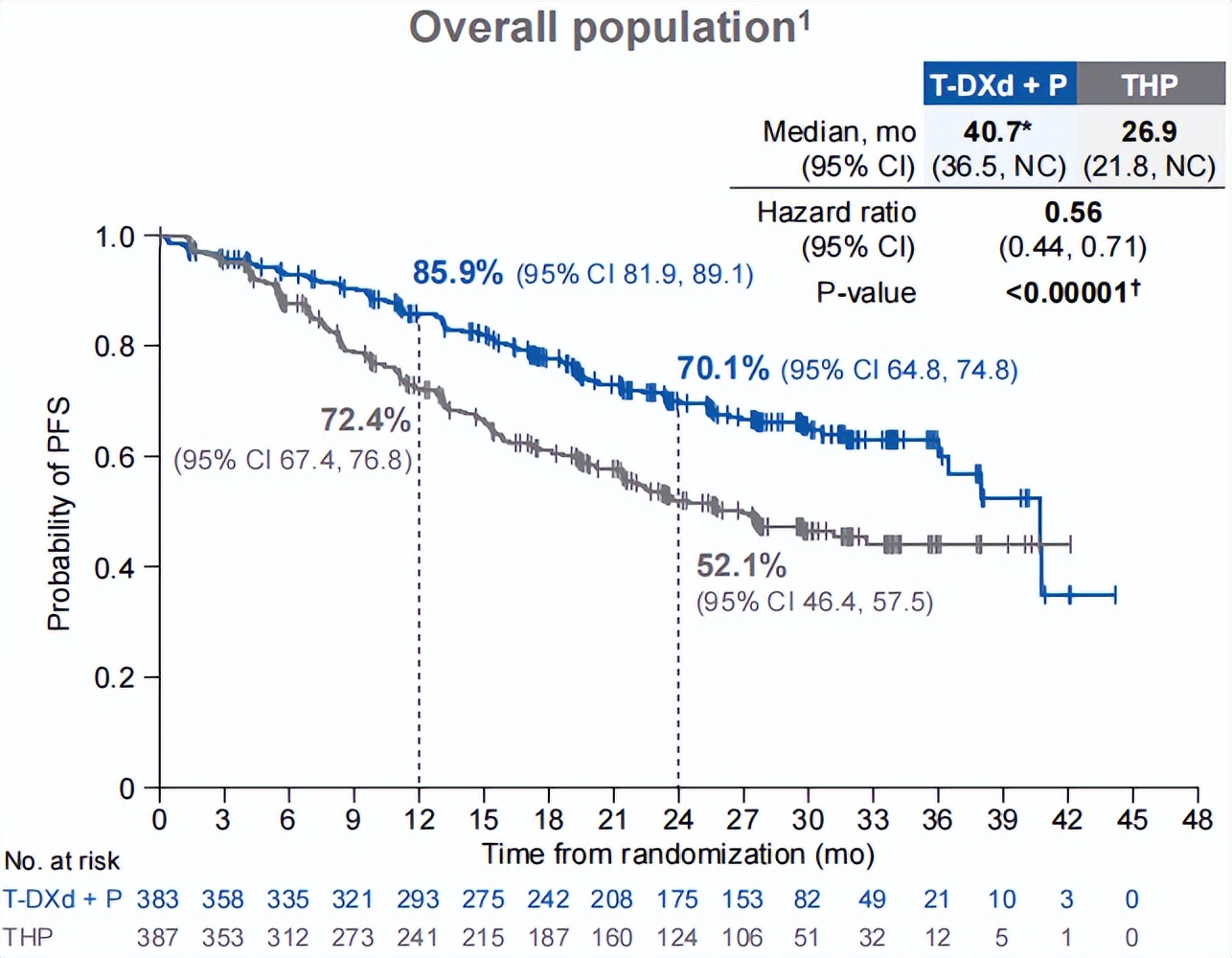 2025年ASCO大会上报告了DB-09研究首次期中分析结果,研究已达到主要终点,即T-DXd+P方案较HP双靶+化疗对照组显著延长了患者无进展生存期(PFS),也取得了40.7个月的目前临床研究一线治疗最长中位PFS,中位PFS绝对值较对照组延长13.8个月,患者疾病进展或死亡风险显著下降44%(HR 0.56,95%CI:0.44-0.71,P<0.00001);研究OS数据尚未成熟,但PFS2同样提示T-DXd+P方案显著获益,中位PFS2尚未达到,但较对照组(36.5个月)也显著延长(HR 0.60,95%CI:0.45-0.79,P=0.00038)。