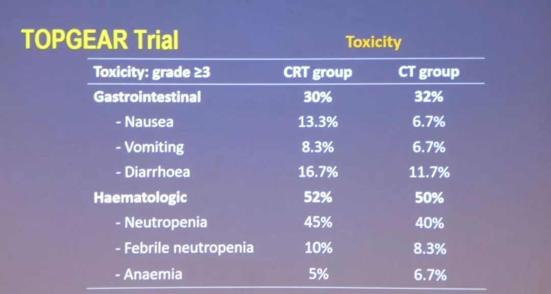 而Leong教授牵头的TOPGEAR(Trial Of Preoperative therapy for Gastric and Esophagogastric junction AdenocaRcinoma)研究是一项国际多中心的3期随机对照临床试验,目的是为了评估新辅助放疗联合围手术ECF化疗对比围手术期ECF化疗的优效性。TOPGEAR研究入组120例患者后的中期分析结果显示:放化疗组和化疗组接受术前化疗(98% vs 93%)、术后辅助化疗(53% vs 65%)的完成率均无统计学差异。在毒副作用方面,放化疗组的胃肠道不良反应是30%,而化疗组是32%,两组无差异。血液不良反应两组亦无差异(52% vs 50%)。而在外科手术方面的并发症方面,3级以上的包括吻合口漏、腹腔感染在内的并发症两组均为统计学差异(22% vs 22%)。所以,新辅助放化疗是安全可行的,但Leong教授也指出术前放疗的质控非常重要,会直接影响患者的疗效。