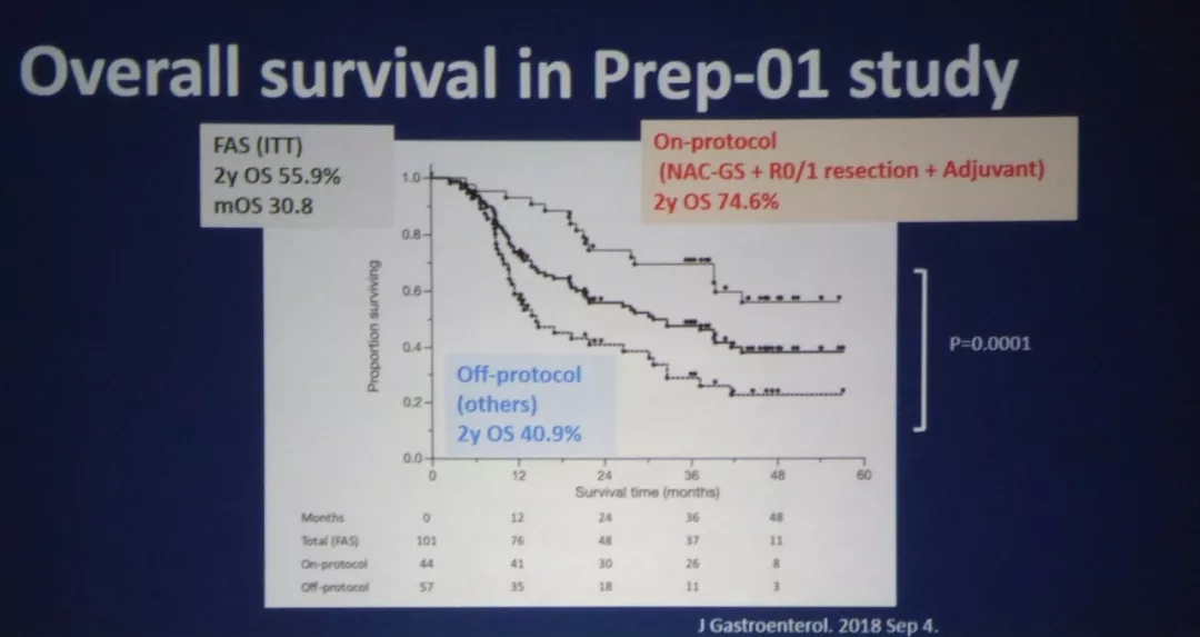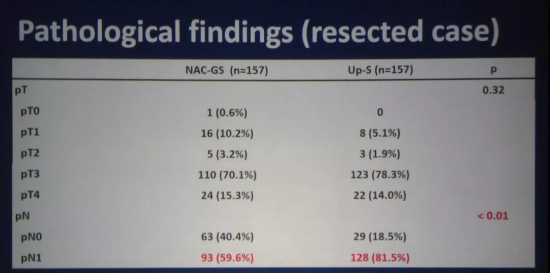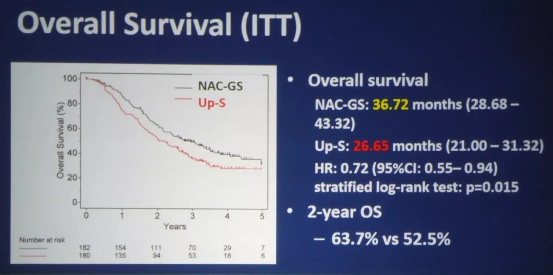 结果:NAC-GS 组的2年OS明显优于Up-S组(63.7% vs 52.5%),NAC-GS 组的中位生存期也明显优于Up-S组(36.72% vs 26.65%,P=0.015),NAC-GS 组的切除率优于Up-S组(93% vs 82%),NAC-GS组3级以上副反应主要为中性粒细胞/白细胞的减少(72.8%),术后病理分期发现NAC-GS组淋巴结阳性率明显低于Up-S组(59.6% vs 81.5% , p<0.01),两组均最易在肝脏复发,但NAC-GS组肝脏复发率明显低于Up-S组(30% vs 47.5%, p=0.01)。