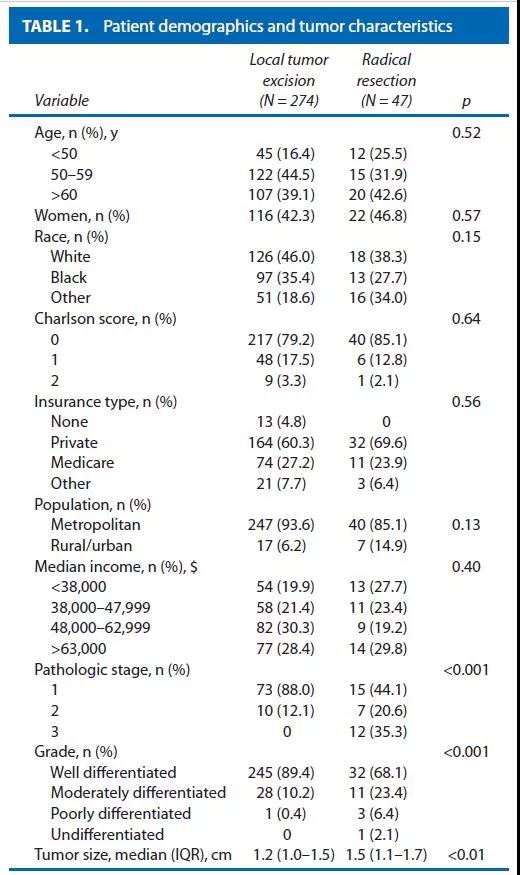 当然,该项研究仍存在一定的局限性。首先,这是一项回顾性研究,其中仅包括2004年至2013年NCDB中包含的数据,虽然样本量很小,但这是迄今为止关于该主题的最大研究之一。其次,本研究中的数据未涉及如肿瘤浸润深度,Ki-67指数,手术细节或术前内镜评估以及局部复发率等数据。第三,局部切除术组的患者由于未进行广泛的淋巴结评估,其期别可能被低估;第四,患者并非随机分配,可能存在偏倚。