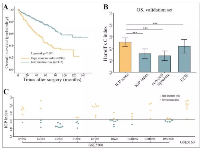 结果显示:在验证队列中,高免疫风险患者其总体生存、无复发生存、疾病特异性生存较低免疫风险患者均显著缩短。通过多因素回归校正肿瘤分期、分级后,免疫评分仍是肾癌患者术后生存的独立不良预后因子。免疫评分与临床病理特征结合构建的诺曼图模型预测准确性高于UISS模型,ccA/ccB分子模型。此外,免疫评分相较于目前使用最广泛的分子预后模型ccA/ccB有更好的肿瘤同质性,肾癌组织同空间位置获得的样本其检测结果较为一致。