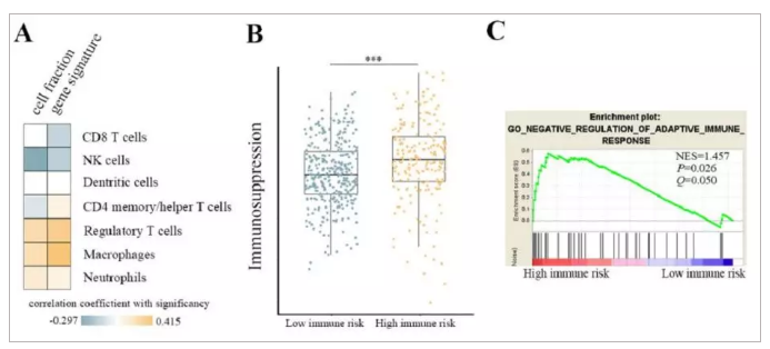 在深入分析免疫评分背后的生物学过程后发现,高免疫风险肾癌组织中有更多的免疫抑制调节性T细胞、巨噬细胞和中性粒细胞浸润,而发挥抗肿瘤免疫功能的自然杀伤性细胞浸润显著减少。免疫逃逸特征性基因复合表达水平以及适应性免疫反应负向调控通路在高免疫风险肾癌患者中显著高于低免疫风险患者,此结果提示高免疫评分肾癌患者的免疫抑制状态可能是导致其生存时间缩短的主要原因。