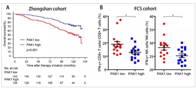 研究首先发现肾癌组织PAK1蛋白表达存在异质性,PAK1高表达提示患者的不良预后以及肿瘤组织抑制性肿瘤免疫微环境的存在。这说明PAK1促癌信号可能通过调节肿瘤免疫微环境参与肾癌进展。