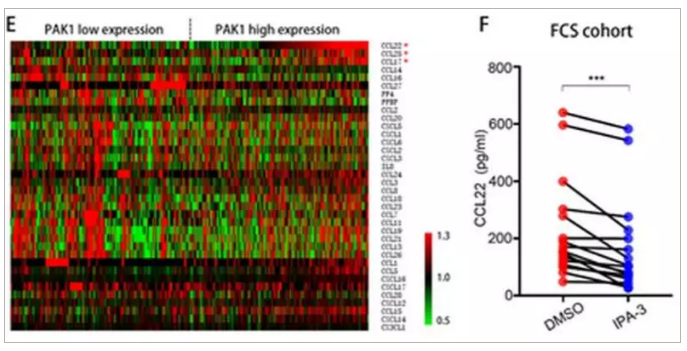 进一步探讨PAK1促进Treg细胞浸润的机制发现,趋化因子CCL22与PAK1的表达显著正相关,在加入PAK1抑制剂处理后,肿瘤组织悬液中CCL22的浓度受到显著抑制。提示PAK1可通过促进肿瘤细胞分泌CCL22,进一步招募Treg细胞向瘤内浸润,介导肾癌细胞免疫逃逸。