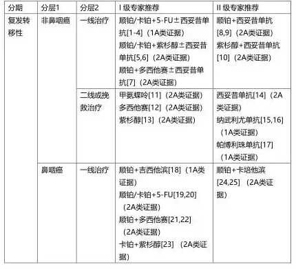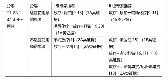 2019版指南新增鼻咽癌采用的也是第8版AJCC分期,病理诊断方面,EBV原位杂交检测的方式是作为I级专家推荐的,在治疗方面:①关于早期鼻咽癌的治疗,推荐IMRT为主的更新的放疗技术,对于T2N1等具有远处转移较高风险的患者,可能需要考虑同期联合化疗。②关于局晚期鼻咽癌的治疗,同期放化疗是标准的治疗模式,其中顺铂是最常用的药物(表1)。对于适宜使用顺铂的患者,可选方案包括单次方案、分次方案或者每周方案。对于不适宜使用顺铂的患者,可选方案包括卡铂、奈达铂和奥沙利铂。对于不适宜接受化疗的患者,放疗联合西妥昔单抗或尼妥珠单抗是可选方案。此外,诱导化疗继以同期放化疗是局晚期鼻咽癌的另一种治疗模式,临床通常用于IV期或肿瘤进展迅速的患者。另外,同期放化疗继以辅助化疗可能会是局晚期鼻咽癌的另一种可选治疗模式。