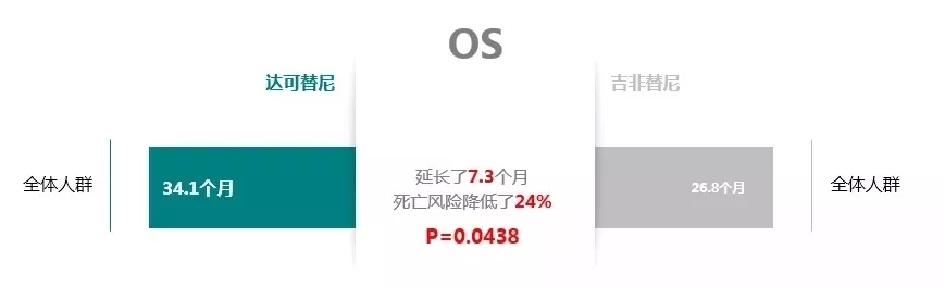 与吉非替尼相比,多泽润®组患者表现出具有临床意义的总生存期(OS)改善,患者死亡风险下降24%。全体人群中,多泽润?组中位OS达34.1个月(吉非替尼组26.8个月),较吉非替尼组延长7.3个月。多泽润®是首个为EGFR突变NSCLC患者提供临床意义OS改善的EGFR-TKI[2,3,4,5]。
