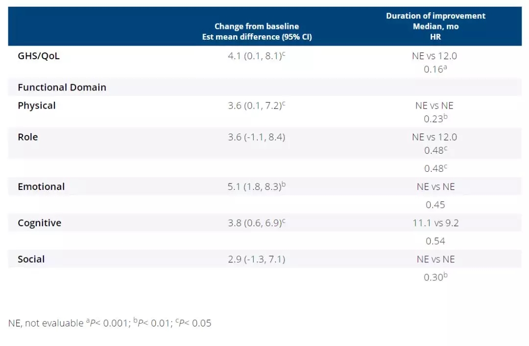 在ALTA-1L研究中,由基线变化的平均差异评估(4.1,P<0.05),以及全球健康状况(GHS)/生活质量(QoL)的改善持续时间(HR=0.16,P<0.001)可见,布加替尼较克唑替尼显著改善总体HRQoL,在多个功能领域和疲劳、恶心/呕吐、食欲减退的症状(P<0.05)改善方面,布加替尼也展现了明显的优势。此外,布加替尼组显示出延长呼吸困难恶化时间的趋势(HR=0.65)。
