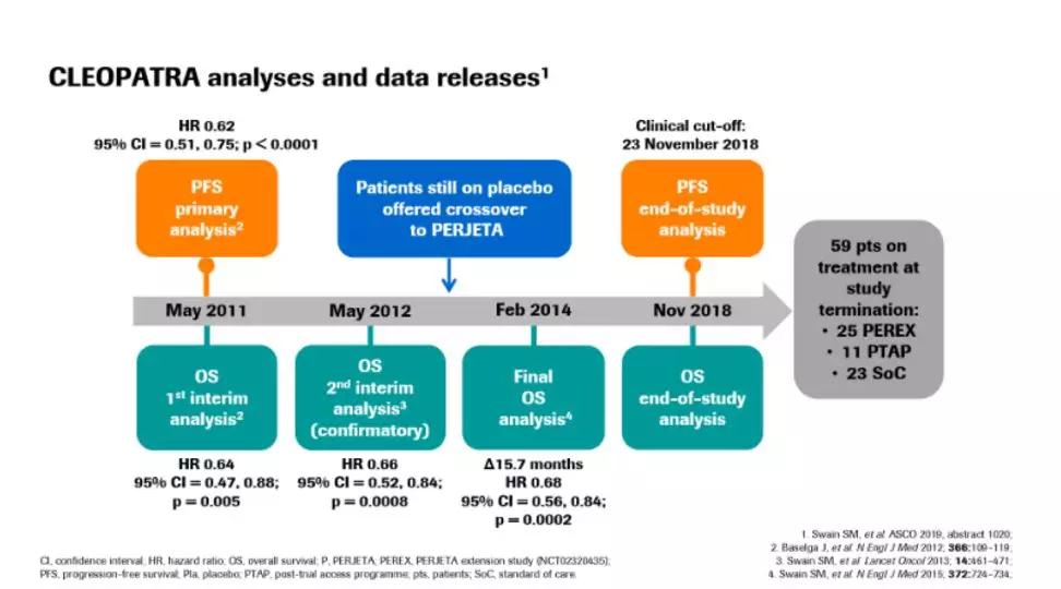 Prof. Swain:CLEOPATRA是较早前设计的,我们在2008年将第一位患者纳入研究。本研究旨在探讨在转移性HER2阳性乳腺癌一线治疗中,在曲妥珠单抗基础上加入帕妥珠单抗能否进一步改善患者预后。因此,研究设计为808名患者随机分为多西他赛、帕妥珠单抗、曲妥珠单抗或多西他赛、安慰剂、曲妥珠单抗。我们在2011年首次报告了主要终点无进展生存期数据,结果表明无进展生存期提高了6个月,随后的数据表明帕妥珠单抗可使患者生存改善约16个月。