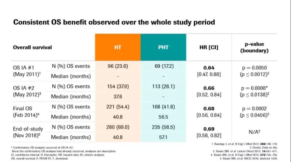 此次我在2019ASCO大会上报告这项研究的最终生存分析数据(截止至2018年11月的生存数据),并确定患者OS结果。随访8年的里程碑式分析显示:接受帕妥珠单抗+曲妥珠单抗“双靶治疗”患者仍有37%的存活,而接受曲妥珠单抗治疗的患者仅有23%存活。这表明OS率至少有14%的改善,中位OS大约有16个月的改善,所以这一点得到了支持。这对患者来说是非常令人兴奋的,因为在过去,他们除了曲妥珠单抗治疗以外不会有更好的生存获益,从而面临死亡的威胁。因此,帕妥珠单抗+曲妥珠单抗“双靶治疗”确实改变了这些患者的轨迹和结果,部分患者甚至可能实现治愈,并且极大地改善了他们的生活。