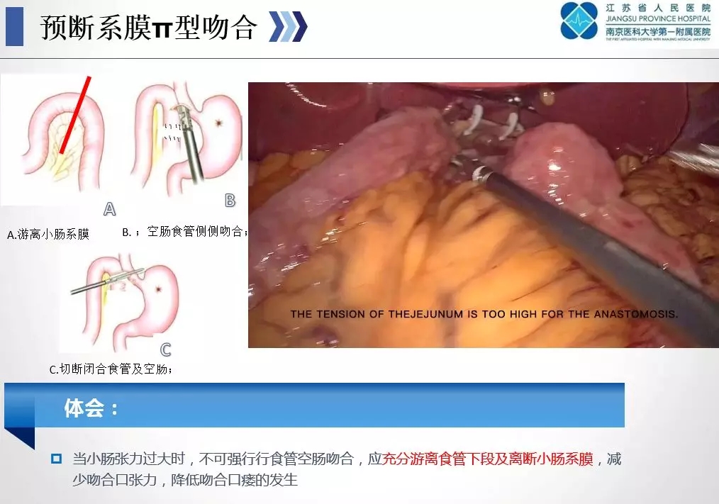 腹腔镜全胃切除后消化道重建的关键步骤是食管空肠吻合。腹腔镜下食管空肠吻合的方式分为管型吻合和直线型吻合,其中常用的管型吻合方式包括荷包缝合法、Orvil法、反穿刺法,常用的直线型吻合方式包括π型吻合和Overlap吻合。各种吻合方式适用指证各不相同。