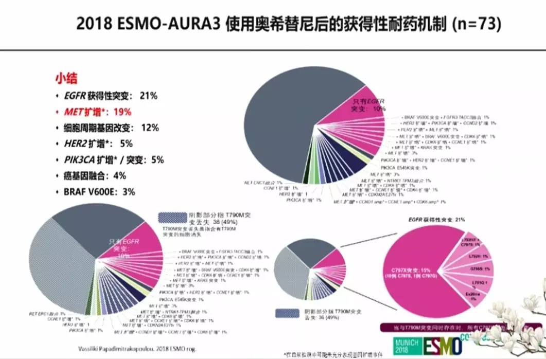 三代EGFR TKI奥希替尼的耐药机制比较复杂,主要有C797S以及Met扩增等。有研究提示,EGFRT790M的丢失与较短的PFS相关,EGFR T790M清除的患者较仍存在T790M的患者的中位PFS短,分别为5.54 vs 7.06个月。另外,一线使用奥希替尼治疗,主要的耐药机制为Met扩增和EGFR C797S突变,其他机制主要包括HER2扩增、PIK3CA及RAS突变等,目前未见获得性EGFR T790M的证据。