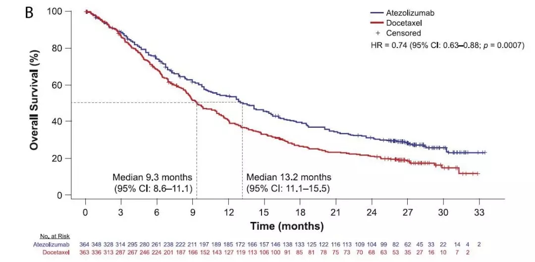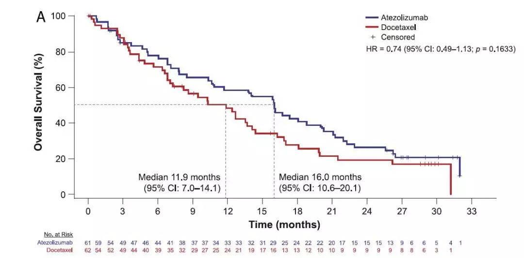 图1:atezolizumab组及多西他赛组在经治无症状脑转移患者及无脑转移患者中的mOS