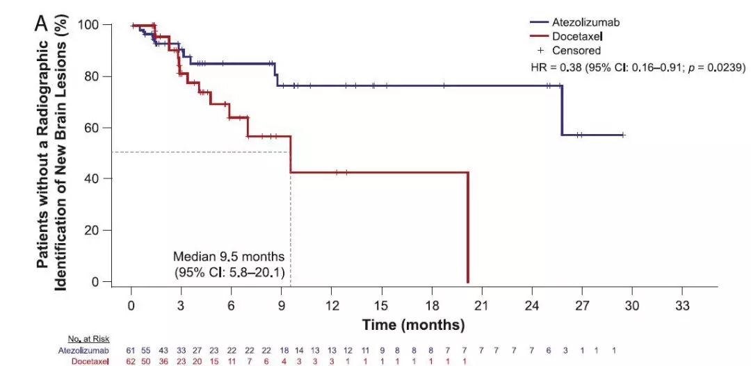 在经治无症状脑转移患者中,影像学上发现新病灶的中位时间atezolizumab组尚未达到,多西他赛组为9.5个月(HR=0.38,95%CI:0.16-0.91;p=0.0239)。而在无脑转移患者中两组中位时间均尚未到达,无显著差异[4](图2)。这提示atezolizumab可能有预防新发脑转移灶的作用。
