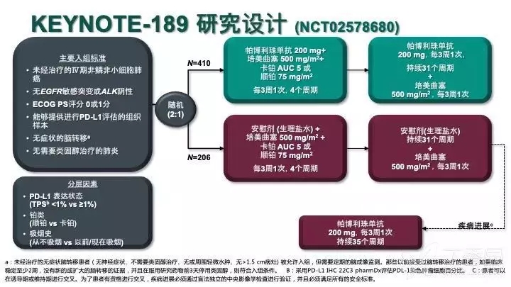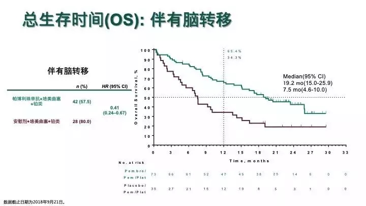 2019年AACR大会公布了Keynote189研究基线合并脑转移患者预后的回顾性分析更新结果。Keynote189研究入组了初治的EGFR、ALK基因突变阴性的晚期非鳞非小细胞肺癌患者,按2:1比例随机分入pembrolizumab联合培美曲塞和铂类组或安慰剂联合培美曲塞和铂类组。