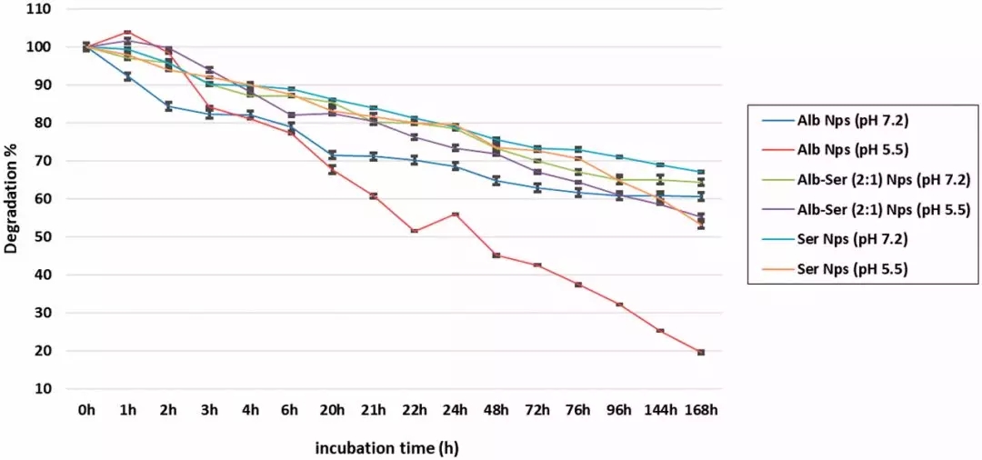 1. NPs的流体动力学大小,zeta电位和形态特征。通过去溶剂化法成功合成了Alb,Ser,Alb-Ser(1:1),Alb-Ser(2:1)和Alb-Ser(1:2)NPs。用Alb-Ser NPs(2:1)制剂获得最小尺寸117 nm。PDI值(多分散指数)在0.015和0.162之间证实所有NP均匀,在水溶液中没有任何聚集。电位分析提示所有纳米颗粒均带负电。经扫描电镜观察,所有的NP均为球形。