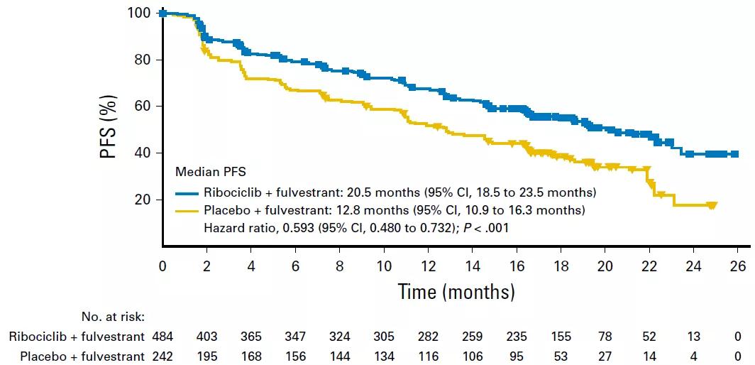 MONALEESA-3研究是一项评估CDK4/6抑制剂Ribociclib联合氟维司群对于未经或经过一线内分泌治疗的HR+HER2-晚期乳腺癌患者治疗的地位,即本研究涵盖了一线和二线的治疗,患者2:1随机入组Ribociclib联合氟维司群(N=484)和安慰剂联合氟维司群(N=242);主要研究终点是PFS,次要研究终点包括OS,ORR和安全性。