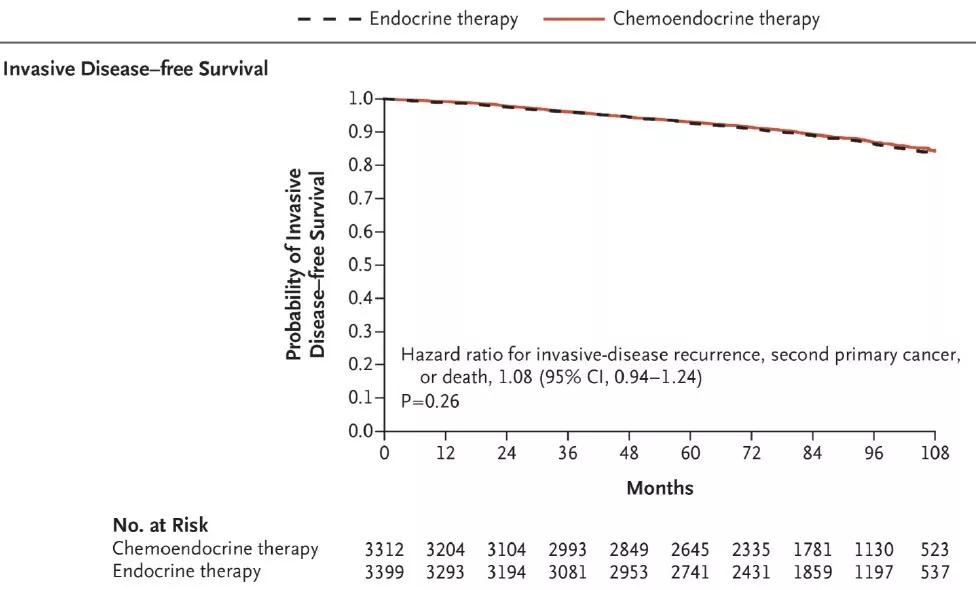 前瞻性的入组了HR+HER2-,腋窝淋巴结阴性的乳腺癌患者,其中6711例(69%)的患者RS评分为11-25分,随机接受化疗或者内分泌单药治疗;研究设计的初衷是对于RS11-25分的患者内分泌单药的iDFS非劣效于化疗。