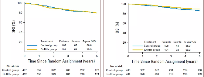 化疗期间使用GnRHa进行保护卵巢和生育功能在绝经前患者中受到争议,2018年发表在JCO的一项meta分析汇总了5项临床研究:包括PROMISE-GIM6、POEMS、Moffitt-ledtrial、GBG-37ZORO、OPTION研究共873例患者;入组的患者为随机(新)辅助化疗或与GnRHa同步进行的;主要研究终点是POI(prematureovarianinsufficiency;早发性卵巢功能不全)和治疗后怀孕比例。次要终点为DFS和OS;