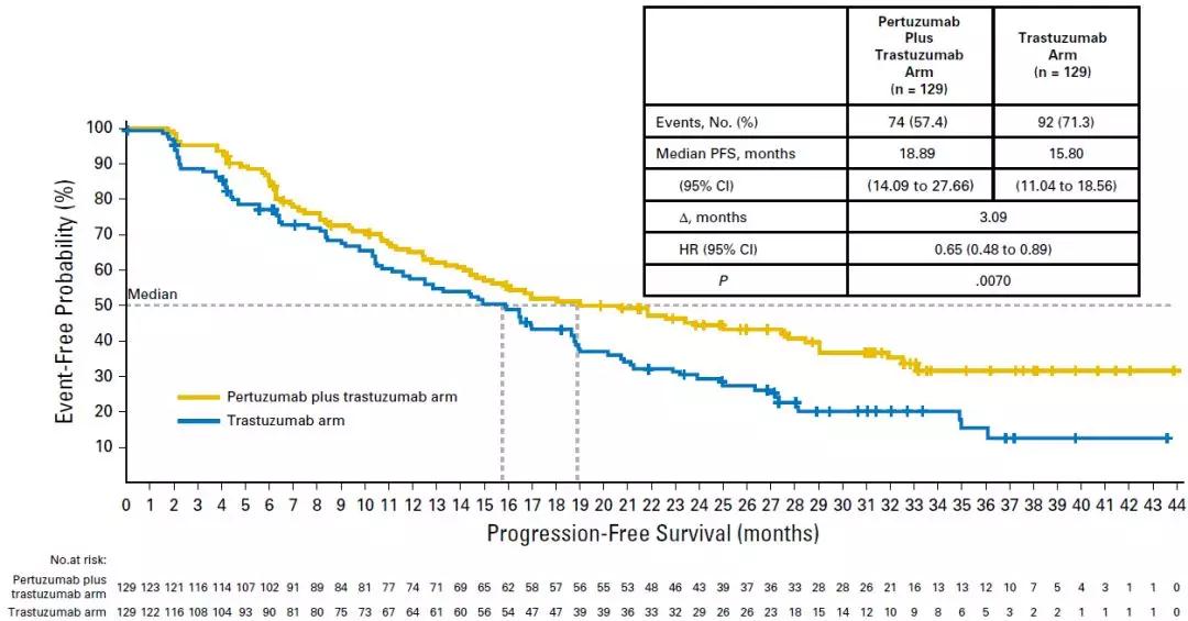 PERTAIN研究是一项随机、开放标签的、多中心II期临床试验,纳入除内分泌治疗外未进行其他全身治疗的HR+HER2+的MBC/LABC患者;按1:1随机分配至帕妥珠单抗联合曲妥珠单抗联合AI或曲妥珠单抗联合AI;在随机分组前研究者会决定是否使用每3周多西他赛或每周紫杉醇诱导化疗18-24周;主要研究终点是PFS;两组分别有75例和71例患者接受化疗。帕妥珠单抗+曲妥珠单抗+AI组和曲妥珠单抗+AI组的PFS分别为18.89个月和15.80个月(HR=0.65;95%CI:0.48-0.89,P=0.0070)