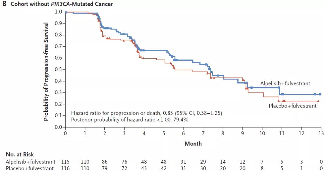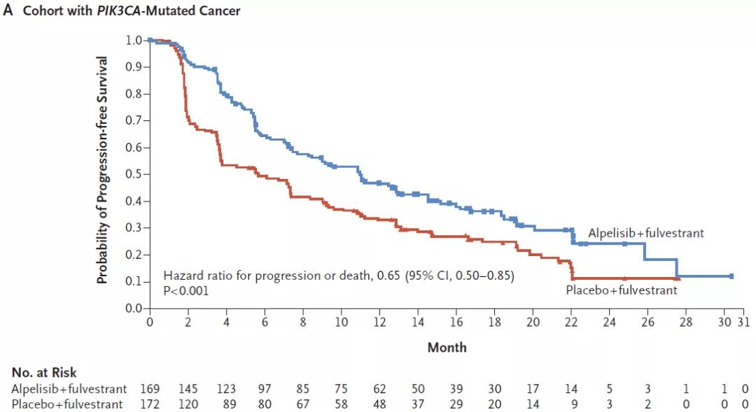 结论:对于接受过内分泌治疗的HR+HER2-晚期乳腺癌患者,alpelisib联合氟维司群可以延长PIK3CA突变患者的PFS。