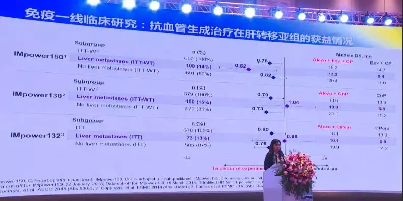 临床前研究提示,免疫和抗血管治疗有协同作用;Impower150临床研究提示,在紫杉醇联合卡铂及贝伐珠单抗三药治疗基础上加上Atezolizumab可改善患者的PFS和OS,尤其是在伴随有肝转移的患者中, PFS和OS改善明显。基础研究提示,肝转移的微环境,其VEGF表达升高,可介导免疫耐受,而抗血管生成药物和免疫药物、化疗恰好起到协同作用,因此可以解释Impower150研究中肝转移患者的生存获益。周彩存教授在2019 ASCO汇报的卡瑞利珠单抗联合阿帕替尼治疗晚期NSCLC的I/II期研究为NSCLC患者带来新希望,这也告诉我们,抗血管生成药物联合免疫治疗是一个可以探索的方向。